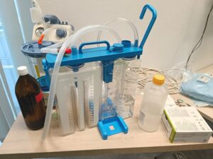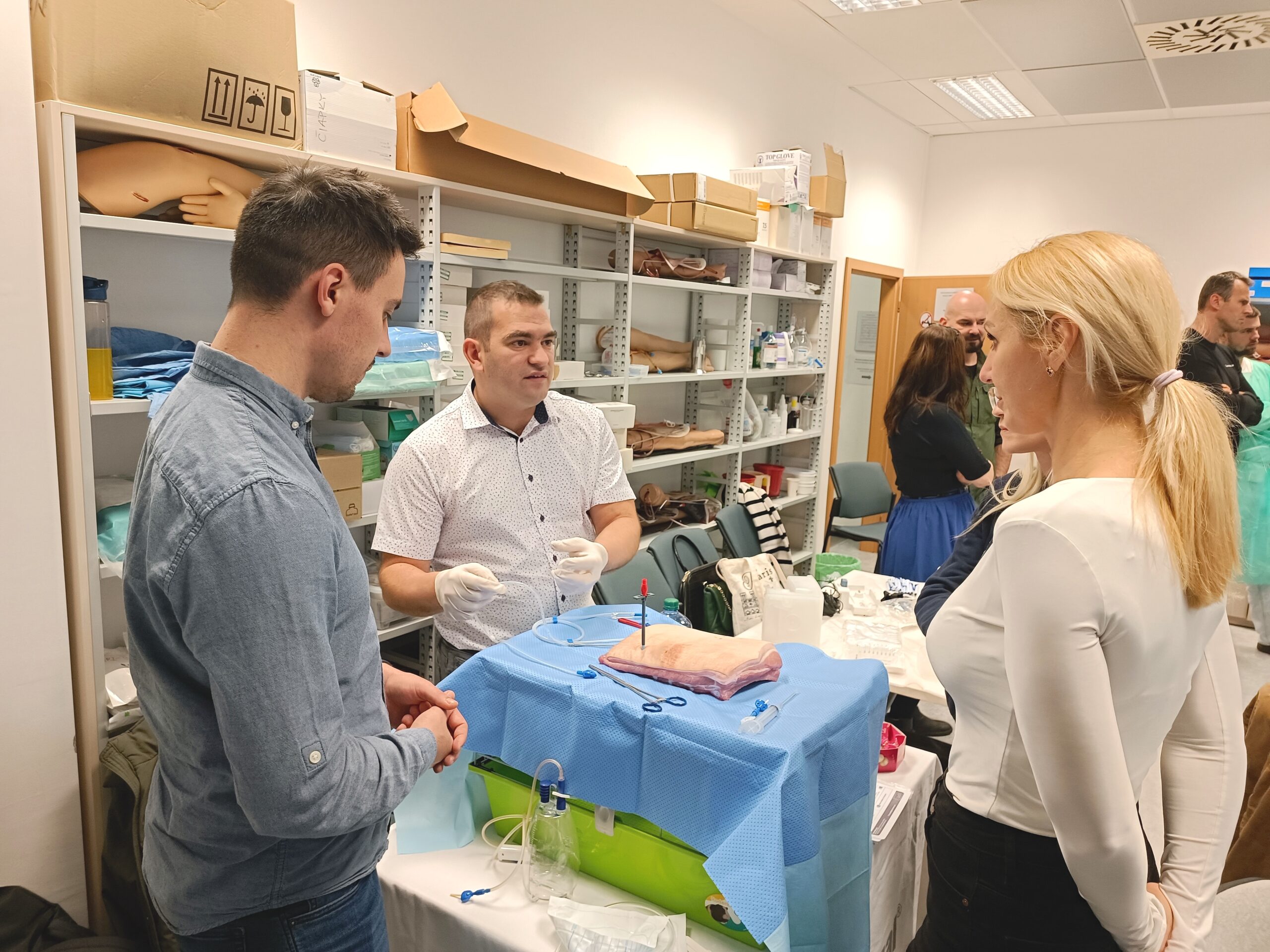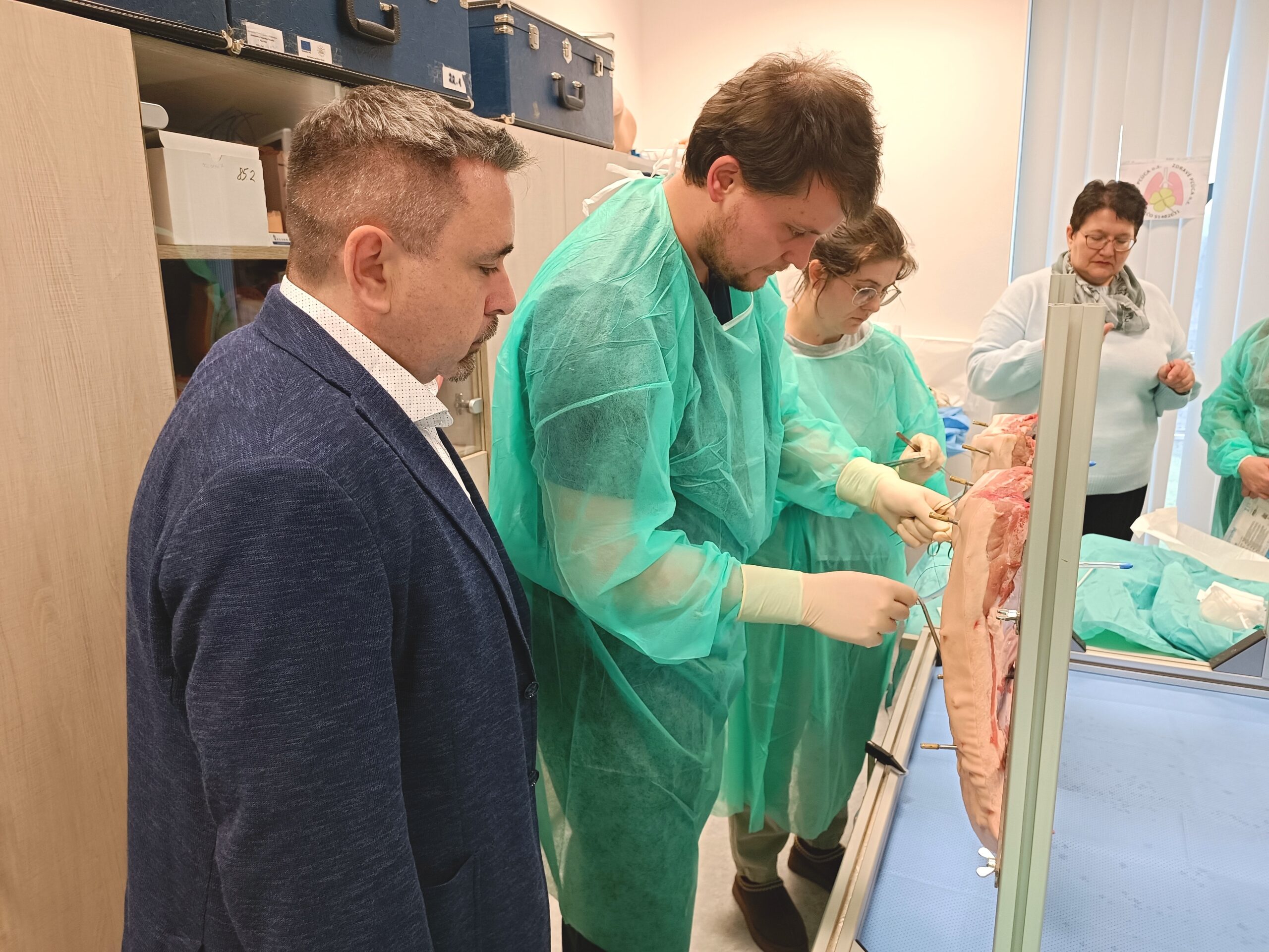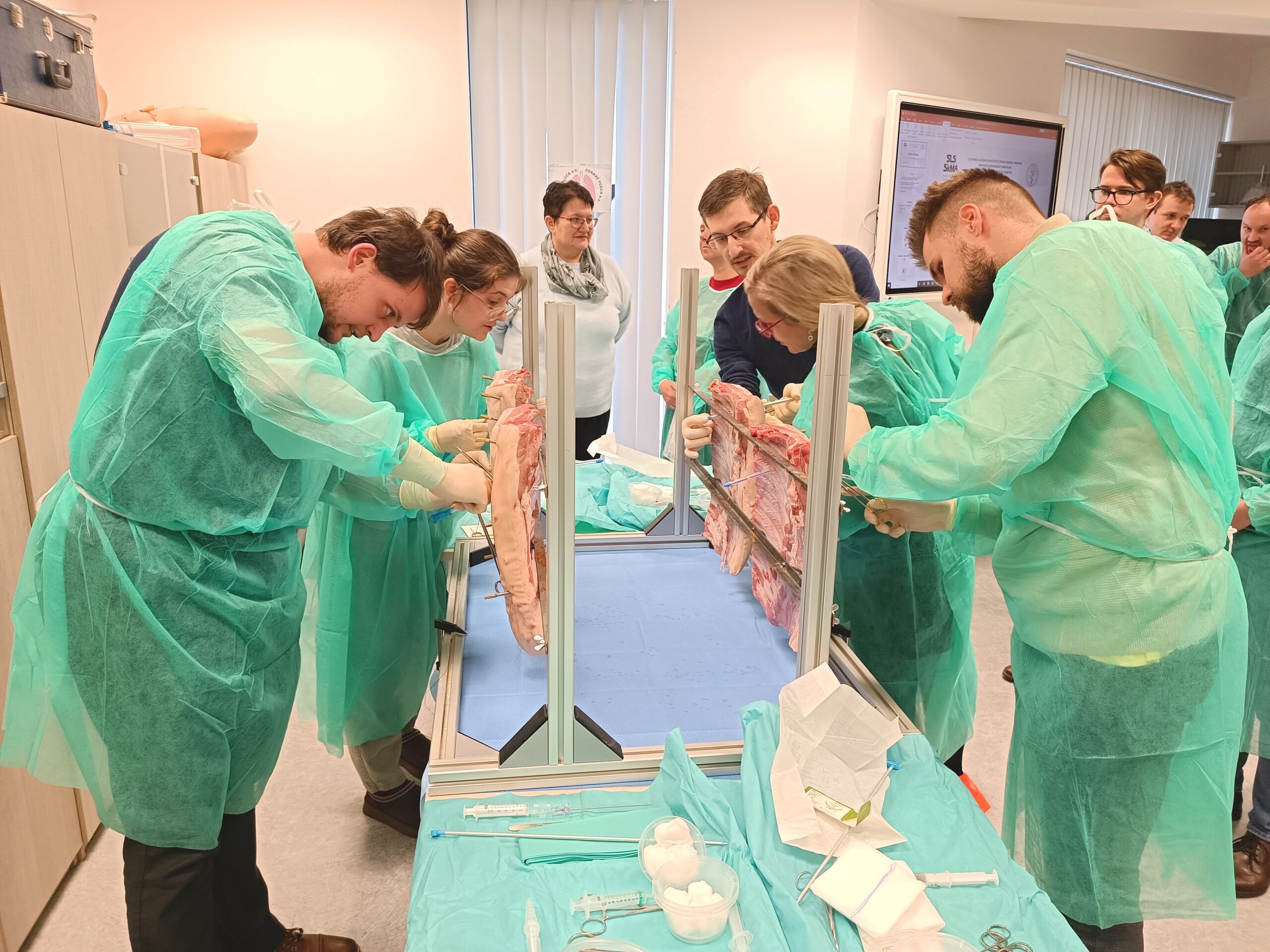 V praktickej časti si lekári pod vedením prednostu kliniky prof. MUDr. Antona Dziana, PhD. vyskúšali samotnú drenáž hrudníka. Na praktické ukážky boli využité bravčové rebrá.